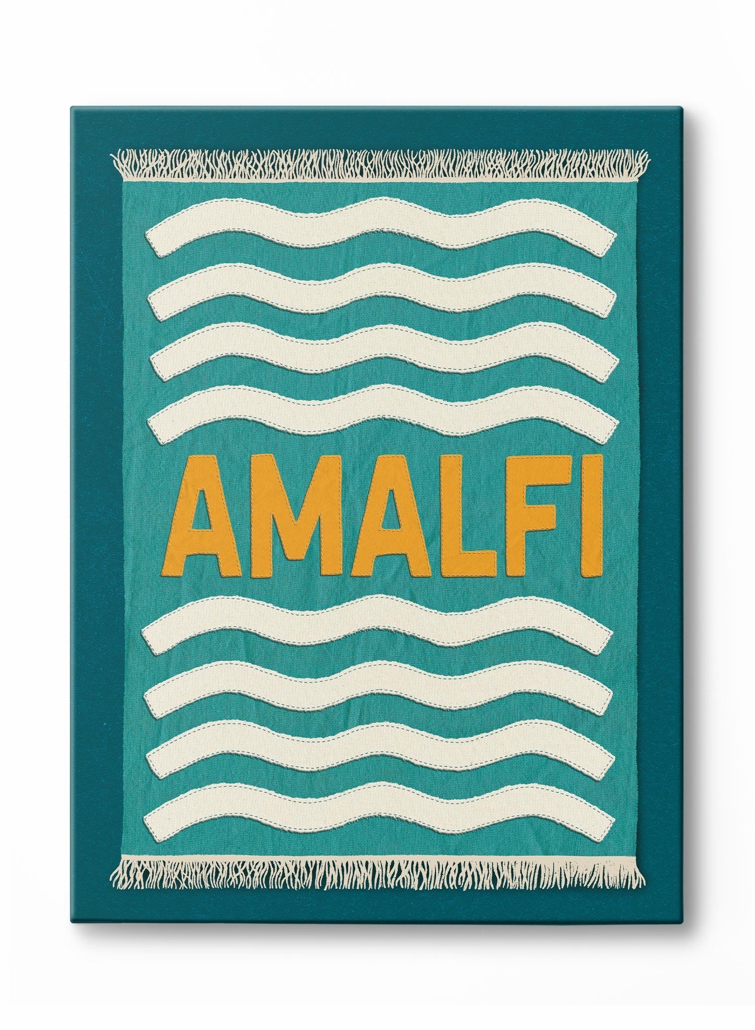 A playful, graphic tribute to the Italian coast, this art print is designed to look like a souvenir beach towel from Amalfi. The design cleverly uses the illusion of texture, with off-white, wavy lines that appear to be stitched onto the fabric and a fringe that seems woven by hand. The word 'AMALFI' is rendered in a bold, friendly font, completing the charming and cheerful holiday aesthetic.