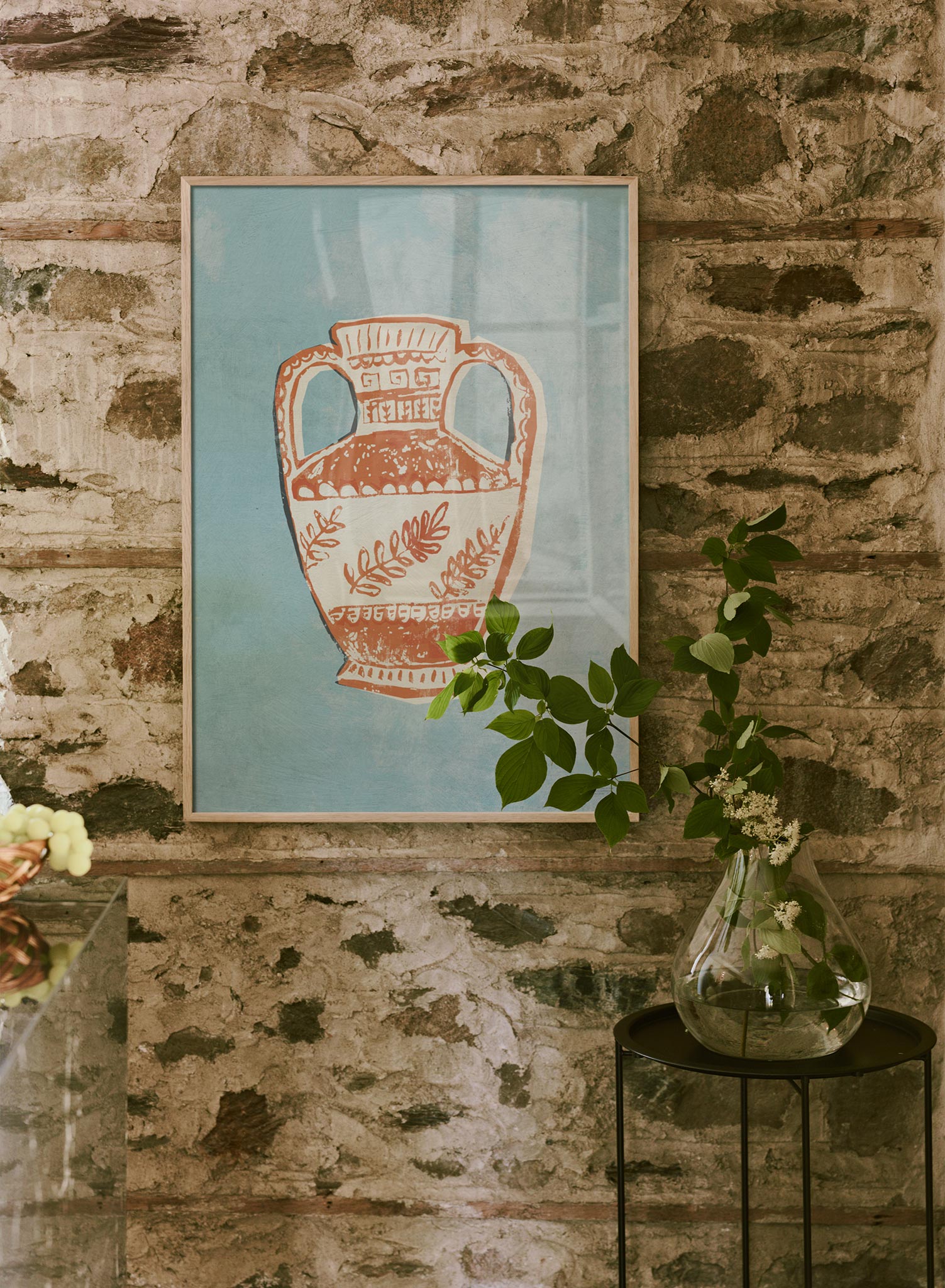The print’s colour palette is elemental and striking. The warm, terracotta orange of the pitcher stands out beautifully against a textured, painterly background of cool blue. This classic warm-and-cool combination is both visually pleasing and timelessly stylish. The slightly imperfect, stylized linework of the decorations enhances the print’s rustic, authentic character.