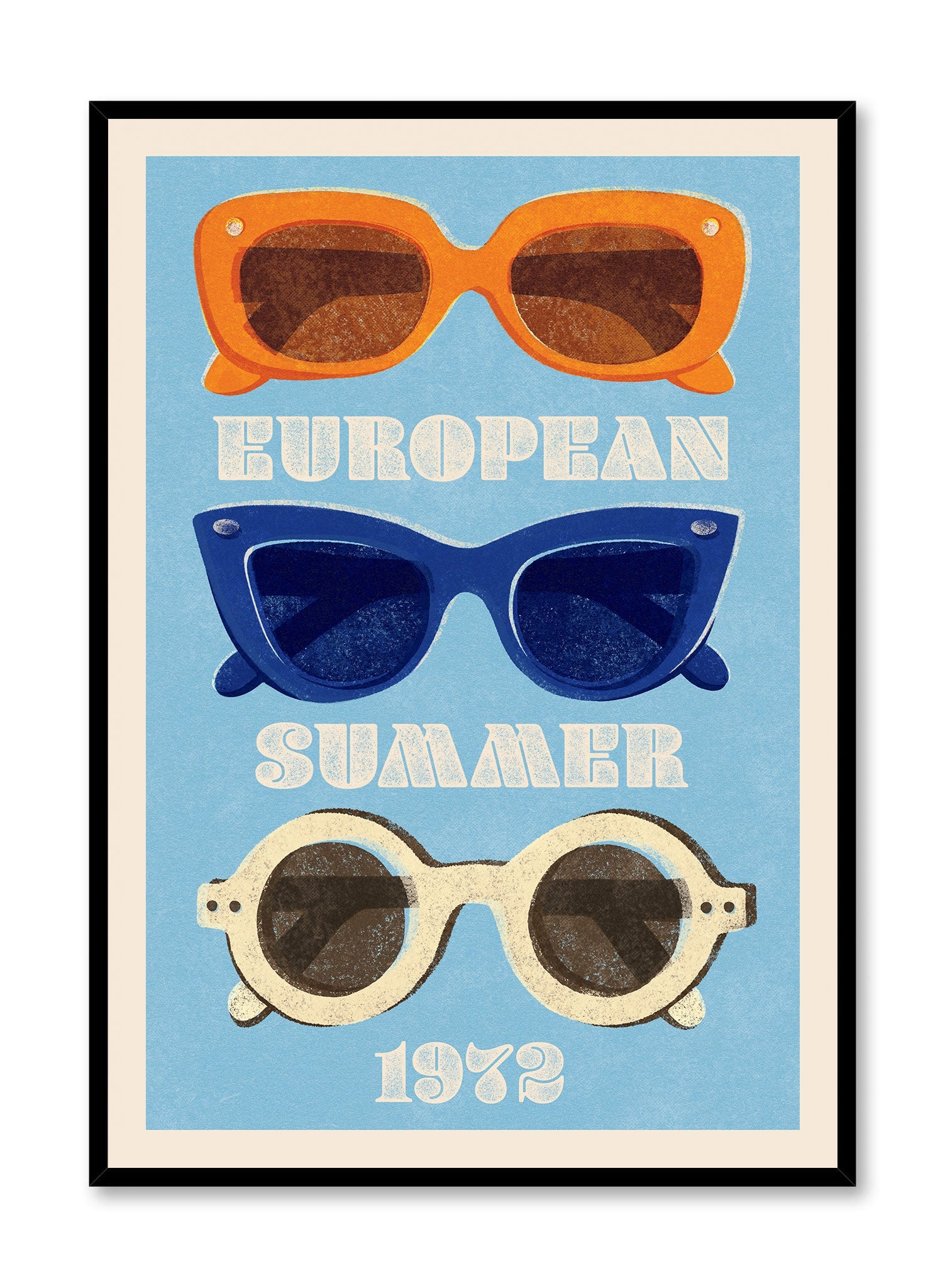 This graphic print features a trio of stylish sunglasses, stacked vertically against a soft blue background in a playful, retro-inspired composition. Bold, blocky text announces 'European Summer 1972,' instantly evoking a sense of fun and nostalgia for sun-filled holidays past. The clean lines and organized layout give the piece a balanced, poster-like quality that feels both spirited and artfully designed.